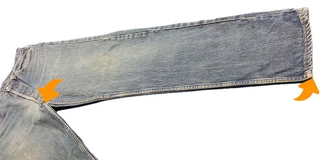 ☆ 下図の矢印(股下縫い目)から矢印(スソ先端)間の、直線距離をはかって下さい。
